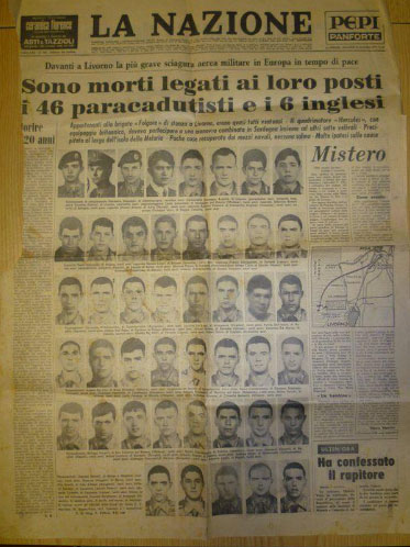 L’Hercules n.4, appartenente alla Royal Air Force e condotto da equipaggio inglese, si inabissò al largo della costa livornese, probabilmente per un guasto, all’alba dell’11 novembre 1971; le operazioni di soccorso si rilevarono inutili e nella sciagura sono deceduti anche 6 militari inglesi dell’equipaggio e tutti i 46 paracadutisti della Brigata Folgore. Cadrà inoltre, nelle successive operazioni di recupero subacque, l’incursore, Serg. Magg. Caria Giannino, decorato dal Presidente della Repubblica con la Medaglia d’Oro con la seguente motivazione: