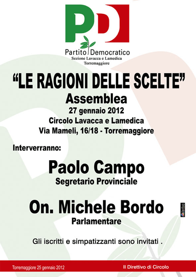 Il Pd di Torremaggiore comunica che l’Assemblea si terrà il 27 gennaio 2012 alle ore 18