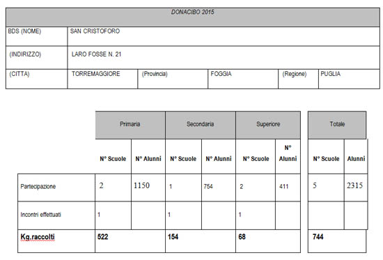Si è conclusa nelle scuole di Torremaggiore la nona settimana del Donacibo organizzata dall’Associazione San Cristoforo in collaborazione con la Federazione Nazionale dei Banchi di Solidarietà.All’invito di sperimentare insieme che donare sé, cioè amare gratuitamente è ciò che dà gioia, hanno risposto oltre 2000 studenti. Attraverso un gesto semplice come il portare dei generi alimentari non deperibili, frutto di qualche loro rinuncia, al punto di raccolta nella loro scuola, sono diventati così protagonisti di questa verifica, ed hanno potuto sperimentare dal vivo la gioia e la bellezza del donare. Il totale di alimenti a lunga conservazioni raccolti hanno superato i 700 chilogrammi. Il cibo donato verrà poi distribuito alle oltre 100 persone assistite dall’associazione San Cristoforo.