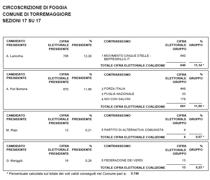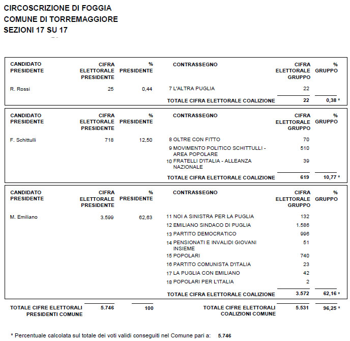 Elezioni Regionali 2015 a Torremaggiore: ecco i voti definitivi delle liste