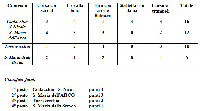 Ecco di seguito il prospetto della classifica generale delle gare del Palio con i rispettivi punteggi accumulati dalle Contrade.