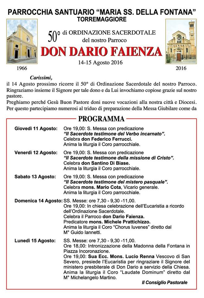 50° di ordinazione sacerdotale del parroco del Santuario della Madonna della Fontana di Torremaggiore, Don Dario Faienza, in programma dall’ 11 al 15 agosto 2016