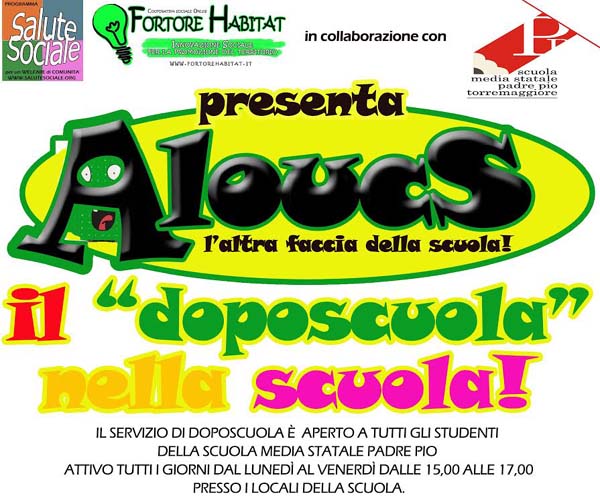 Dopo la stipula della convenzione tra la Scuola Media Statale Padre Pio di Torremaggiore e la cooperativa sociale onlus Fortore Habitat è partito “Aloucs”, il primo servizio di “doposcuola” aperto a tutti gli studenti e realizzato nella scuola e con la scuola.