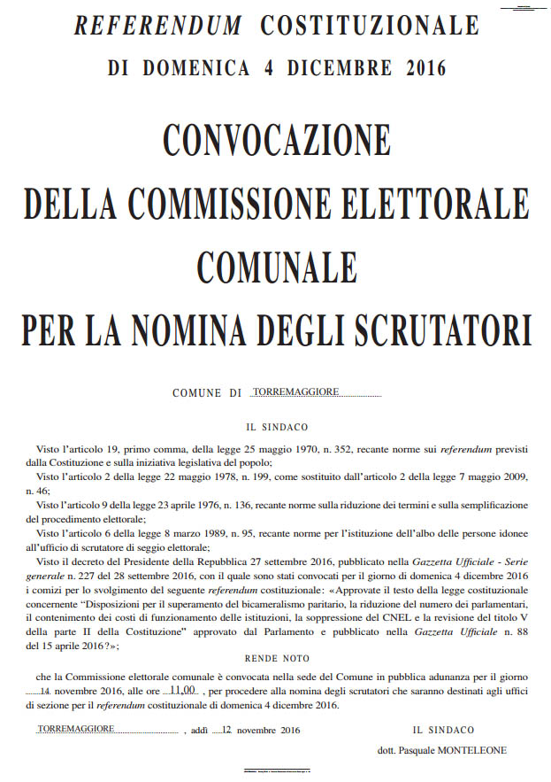Commissione Elettorale Comunale convocata il 14 novembre alle ore 11 per la nomina degli scrutatori al referendum costituzionale del 4 dicembre 2016