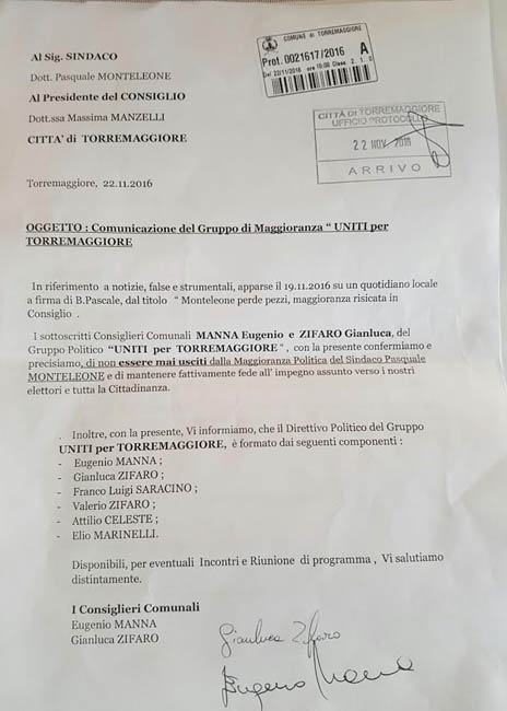 Pubblichiamo nota protocolata presso il Comune di Torremaggiore in data 22 novembre 2016, dove si evince che i due consiglieri di maggioranza Manna Eugenio e Zifaro Gianluca che si erano dichiarati indipendenti nei gioni scorsi ( leggi qui la nota ) confermano la loro appartenza alla maggioranza politica che supporta il Sindaco Pasquale Monteleone.
