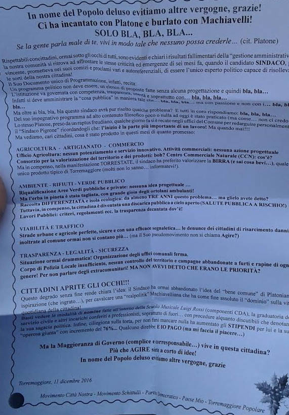 Domenica 11 dicembre ore 19:00 in Corso Matteotti di fronte la Banca Credem le forze di opposizione in consiglio comunale terranno una manifestazione pubblica per fare una disamina dei primi sei mesi dell’Amministrazione Monteleone. Segue volantino distribuito in piazza domenica mattina 11 dicembre 2016.