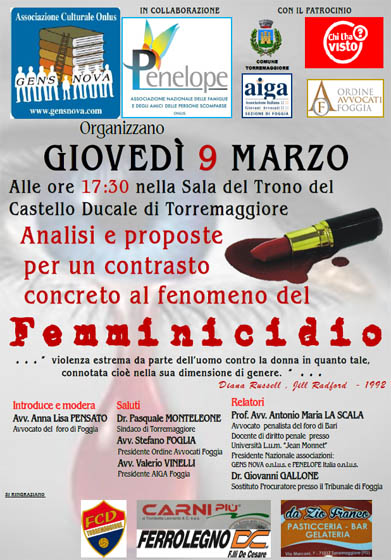 L’associazione Gens Nova Onlus in collaborazione con l’associazione Penelope Puglia Onlus e l’Aiga di Foggia organizza un incontro su “Analisi e proposte per un contrasto concreto al fenomeno del Femminicidio” che si terrà Giovedì 9 Marzo ore 17:30, presso la Sala del Trono del Castello Ducale di Torremaggiore.