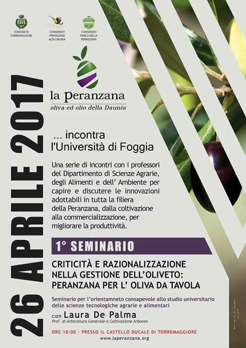 Dal 26 aprile 2017 iniziano “i Mercoledì della agriCultura” organizzati dall’Associazione La Peranzana oliva e olio della Daunia patrocinati dall’Amministrazione Comunale di Torremaggiore e in collaborazione con il Consorzio Peranzana e con il Consorzio Parco della Peranzana.