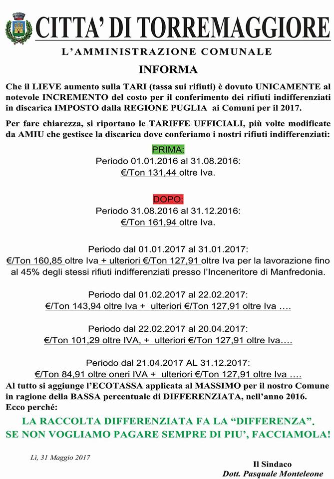 L’Amministrazione Comunale comunica le ragioni del lieve aumento della TARI a Torremaggiore