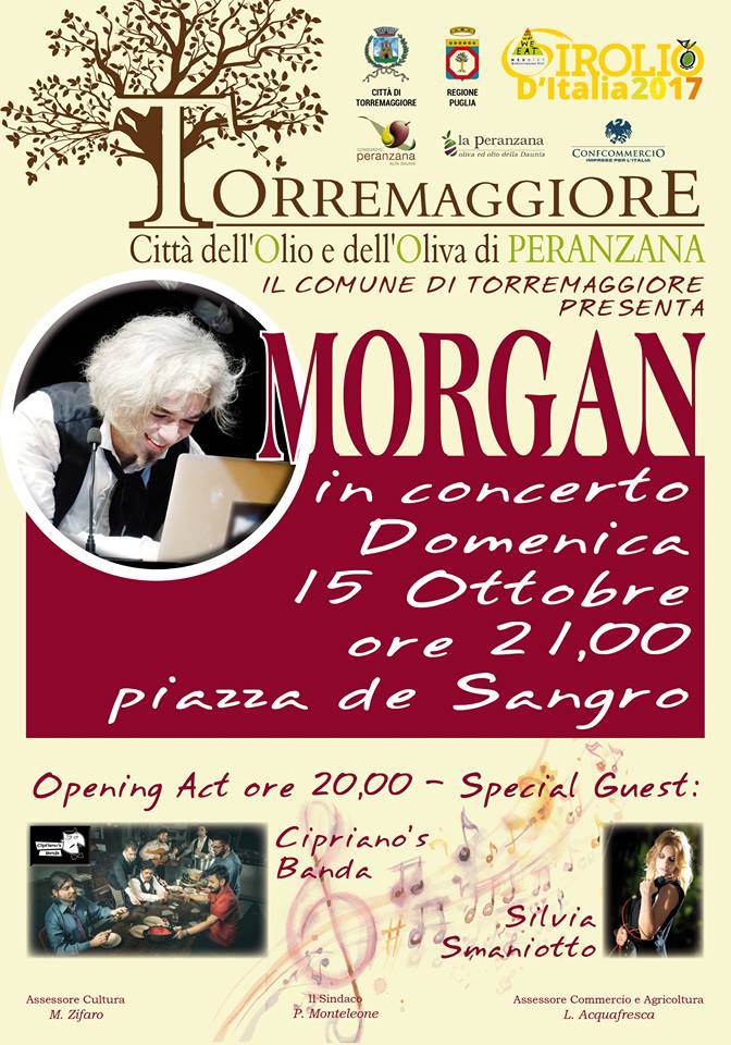 Morgan in concerto a Torremaggiore domenica 15 ottobre 2017 in Piazza Raimondo De Sangro