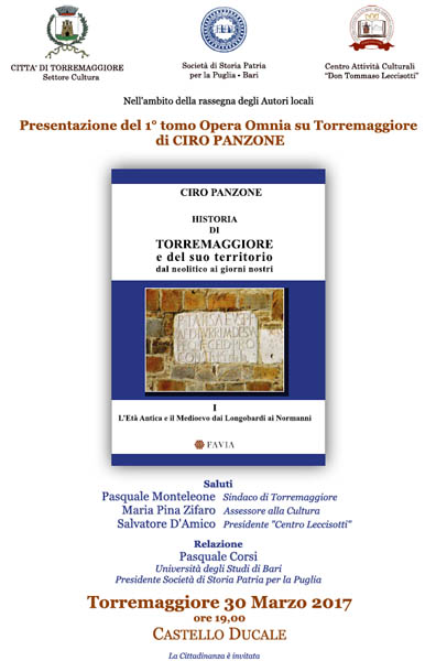 Il 30 marzo 2017 alle ore 19.00 ci sarà la presentazione del 1° tomo dell’opera omnia “HISTORIA DI TORREMAGGIORE E DEL SUO TERRITORIO dal Neolitico ai giorni nostri” di Ciro Panzone presso il Castello Ducale De Sangro di Torremaggiore