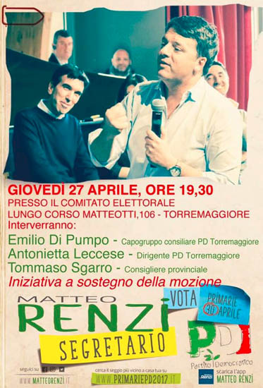 Giovedì 27 aprile 2017 alle ore 19,30 presso il Comitato Elettorale lungo Corso Giacomo Matteotti 106 a Torremaggiore iniziativa a sostegno della mozione che supporta Matteo Renzi Segretario.