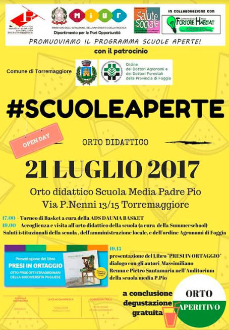 Il giorno venerdì 21 luglio la presentazione del volume intitolato “Presi in Ortaggio” presso l’orto didattico della Scuola Media Statale Padre Pio di Torremaggiore, dove è in corso la Summer School , un’importante iniziativa all’interno del quadro “scuole aperte”, realizzata dalla scuola in collaborazione di altre associazioni del territorio, tra cui la Cooperativa Sociale Fortore Habitat.