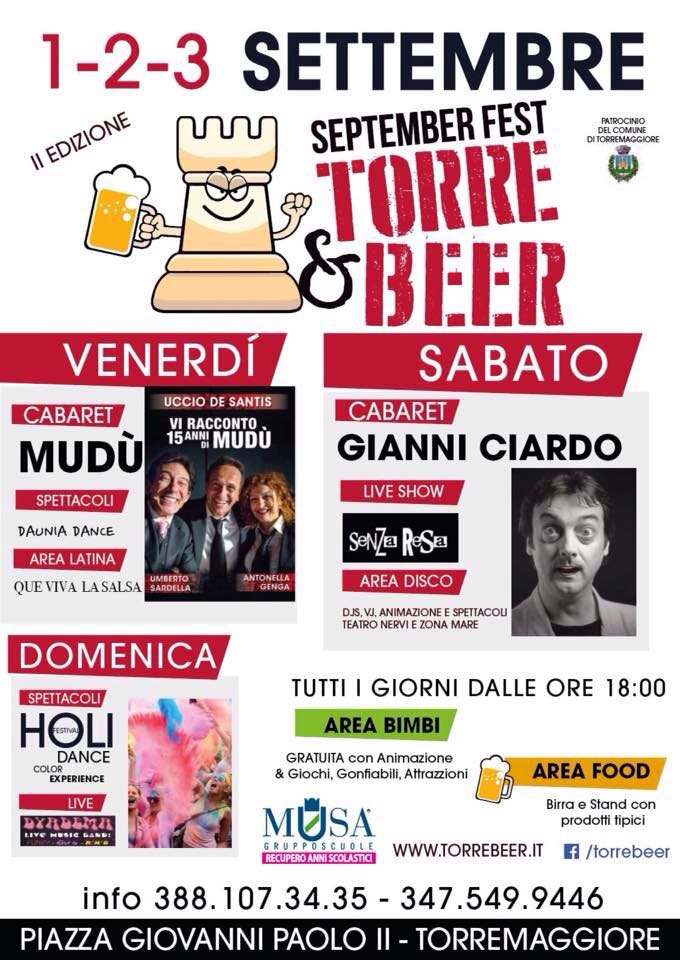 Ispirata al celeberrima Octoberfest Bavarese, Torre & Beer Septemberfest oltre alla birra offrirà spettacoli della tradizione pugliese e piatti tipici del territorio . Una festa non solo per famiglie , a tal proposito abbiamo realizzato un grande area per bambini GRATUITA; ma soprattutto per giovani con appuntamenti musicali di grande rilevanza , ed eventi di tipo House Music , Edm , Commerciale e Latino . Musiche popolari , Gruppi live e Cover band animeranno tutte le serate in programma .