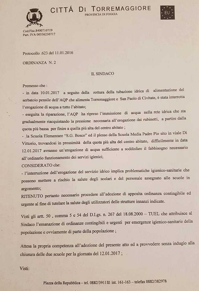 Il SINDACO INFORMA che a seguito della rottura della tubazione idrica di alimentazione del serbatorio pensile dell’AQP, che alimenta Torremaggiore e S. Paolo di C., e della conseguente riparazione della stessa, si è ritenuto necessario procedere all’adozione di una apposita ordinanza