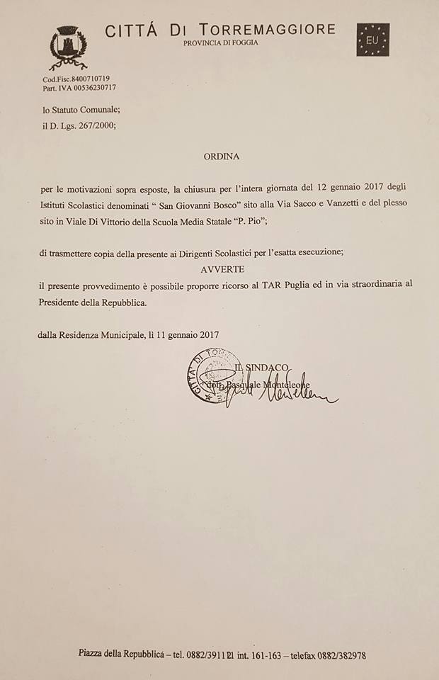contingibile e urgente di chiusura per l’intera giornata del 12 gennaio 2017 delle scuole: Elementare “S. Giovanni Bosco” e succursale della Media “Padre Pio” (Pineta), le quali trovandosi in prossimità della quota più alta del centro abitato, difficilmente avranno il suindicato giorno 12 un’erogazione di acqua sufficiente a soddisfare il fabbisogno necessario al funzionamento dei servizi igienici. Tanto per tutelare la salute degli alunni e del personale impegnato nelle suindicate strutture scolastiche.