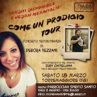 Sabato 18 marzo 2017 alle ore 20 presso la Parrocchia dello Spirito Santo di Torremaggiore (Fg) si terrà l’evento “Come un prodigio tour – concerto testimonianza di Debora Vezzani” . Una occasione imperdibile per conoscere l’esperienza – raccontata in parole e musica – di una giovane cantautrice, che, nella prova, si è sentita toccare e risollevare dalla dolce forza dell’amore di Dio. La sua è, perciò, una bella e profonda testimonianza in musica di come l’incontro con il Sacro Cuore di Gesù possa stravolgere le nostre vite e caricarle di frutti d’amore da donare al mondo intero.