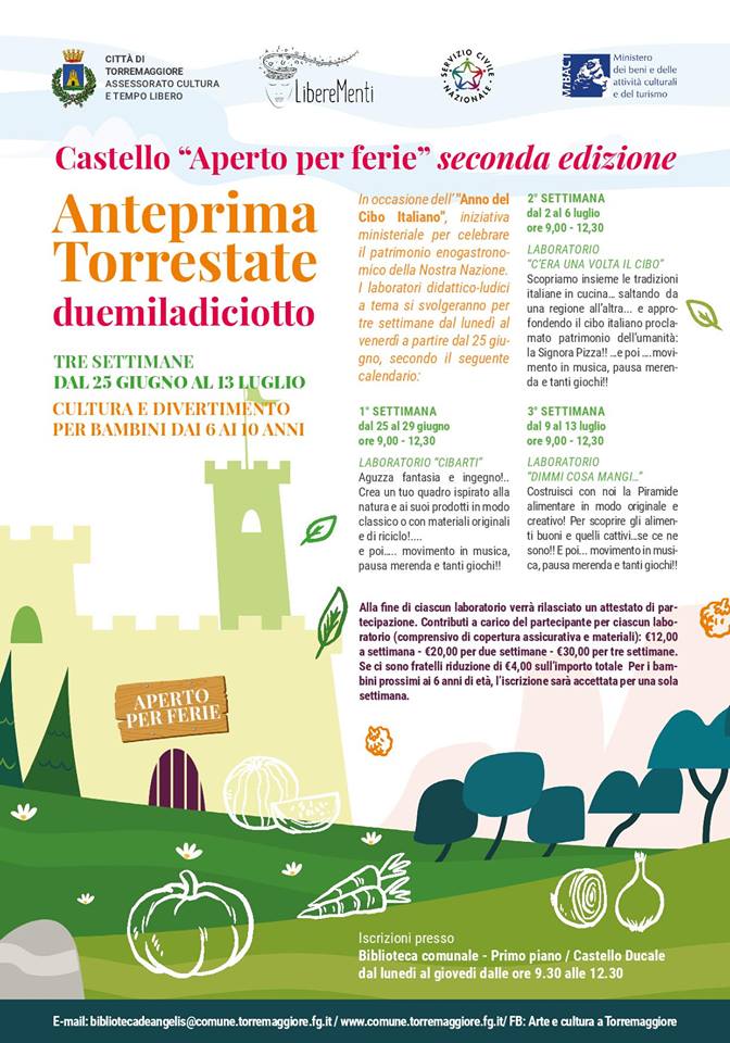 L’assessorato alla Cultura del Comune di Torremaggiore, in collaborazione con l’associazione “LibereMenti” e con il Servizio Civile Nazionale, nell’anno internazionale del cibo italiano promosso dal Ministero dei Beni, attività culturali e tempo libero, propone “Anteprima Torrestate 2018 – Castello aperto per ferie”. Giunta alla seconda edizione, la manifestazione propone attività per bambini e ragazzi dai 6 ai 10 anni e prevede tre settimane di cultura del cibo, divertimento e laboratori didattico-ludici a tema dal 25 giugno al 13 luglio.
