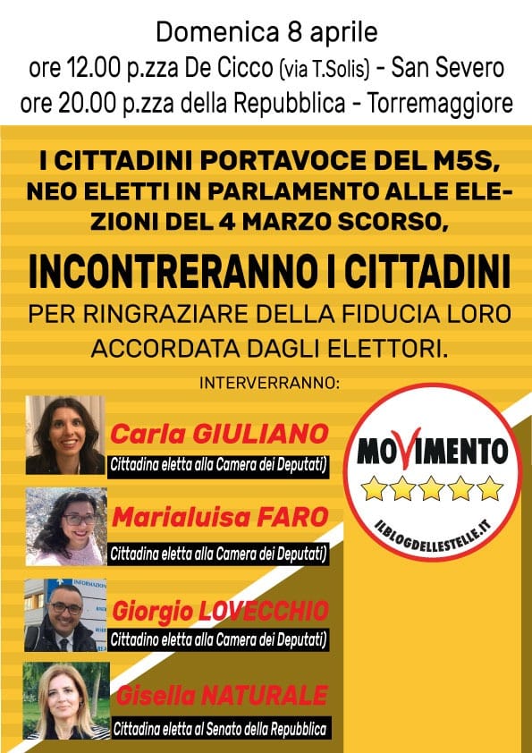 Comizio del M5S di ringraziamento domenica 8 aprile 2018 a Torremaggiore in Piazza della Repubblica