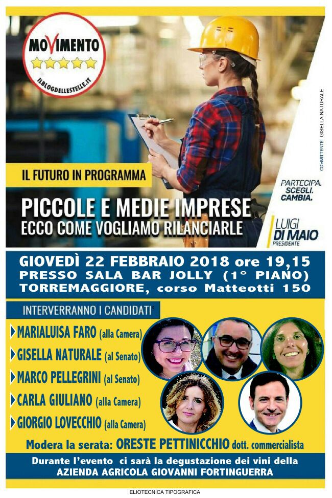 Evento politico il 22 febbraio 2018 a Torremaggiore con il Movimento Cinque Stelle: interventi dei candidati alla Camera ed al Senato