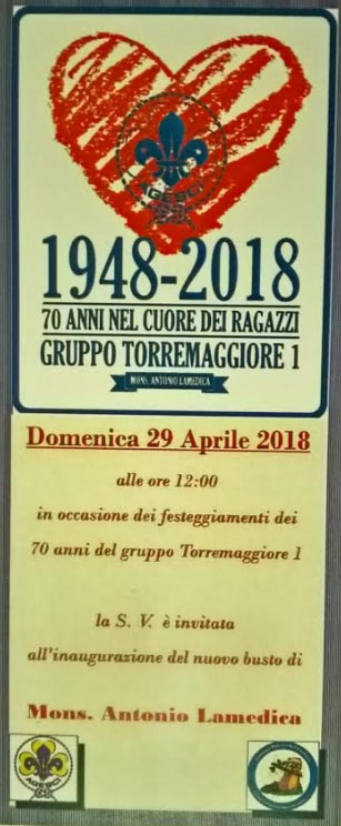 In occasione dei festeggiamenti del Settantennale del Gruppo scout Torremaggiore 1 ci sarà domenica 29 aprile 2018 presso il Piazzale Lucio Palma ed Antonio Piacquaddio l’inaugurazione del nuovo busto dedicato al fondatore Mons. Antonio Lamedica a partire dalle ore 12.00. Il precedente busto in bronzo era stato derubato nella notte tra il 22 ed il 23 febbraio 2017.