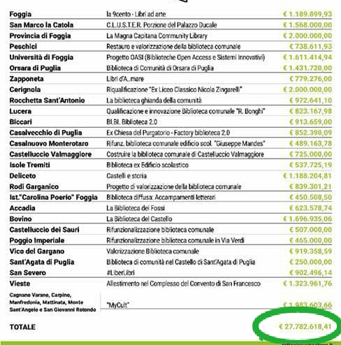 Dei circa 28 milioni di euro, stanziati per il progetto “Community library ” , di cui hanno beneficiato svariati comuni della nostra provincia, Torremaggiore non vedrà un centesimo. Il sindaco Monteleone che si è affrettato a sbandierare la partecipazione a questo progetto con proclami autoreferenziali, oggi ha taciuto la bocciatura dello stesso. I cittadini è giusto che sappiano che la responsabilità di questa grave esclusione è da imputare unicamente all’ incompetenza di chi ha presentato un progetto inadeguato e incompleto: Monteleone e la sua giunta!