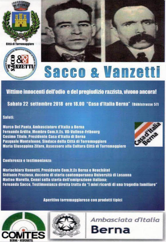 Si terrà sabato 22 settembre alle 18 nella “Casa d’Italia” a Berna in Svizzera, un convegno dedicato alle figure di Sacco e Vanzetti. Alla manifestazione parteciperanno il Sindaco di Torremaggiore, Pasquale Monteleone; l’ambasciatore d’Italia a Berna, Marco Del Panta; il membro del Comitato degli italiani all’estero VD Vallese-Friburgo, Fernando Ardito; il presidente della “Casa d’Italia” di Berna, Cosimo Titolo; Maria Chiara Vannetti, presidente del Comitato italiani all’estero Berna-Neuchatel; Stefanie Prezioso, docente di Storia contemporanea all’Università di Losanna; Matteo Marolla, che interverrà con cenni sulla storia dell’emigrazione italiana; Fernanda Sacco, con la sua testimonianza diretta tratta da “I miei ricordi di una tragedia familiare”. Al termine della manifestazione, aperitivo torremaggiorese con prodotti tipici.
