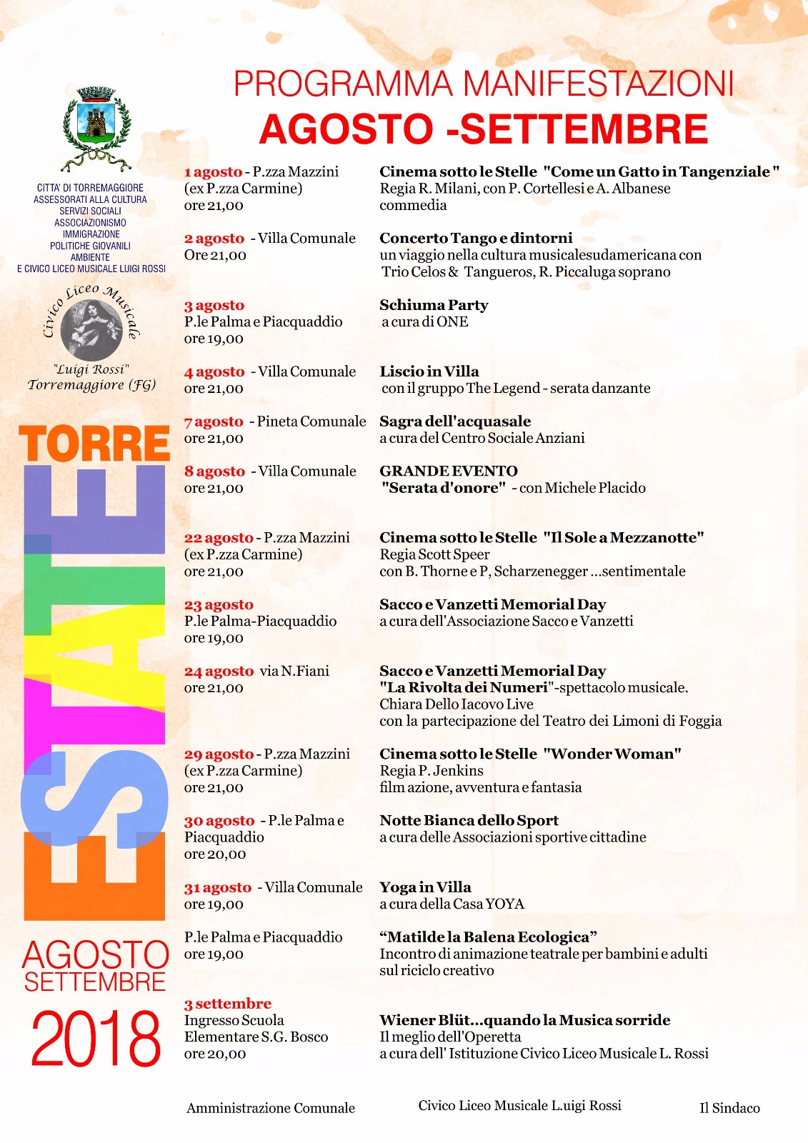 Ufficializzata la seconda parte del cartellone estivo “Torrestate 2018” i cui appuntamenti avranno luogo nel centro dell’Alto Tavoliere dal 1 agosto al 3 settembre. Il “Torrestate” è organizzato dal Comune di Torremaggiore in collaborazione con il civico liceo musicale “Luigi Rossi”. Il clou sarà mercoledì 8 agosto alle 21 in Villa Comunale con una serata d’onore che vedrà protagonista Michele Placido. Il 24 agosto alle 21 in via Fiani spazio al “Sacco e Vanzetti memorial day” con lo spettacolo musicale “La rivolta dei numeri”, live di Chiara Dello Iacovo, con la partecipazione del “Teatro dei Limoni” di Foggia. Altro appuntamento di rilievo sarà la “Notte bianca dello Sport” il 30 agosto alle 20 in piazza Palma e Piacquaddio a cura delle associazioni sportive cittadine. “Ancora una volta siamo risusciti a proporre al pubblico un’offerta variegata e che sappia tener conto delle esigenze di tutte le fasce d’età. Auguro una buona estate torremaggiorese a tutti all’insegna della qualità, della bellezza, dello svago e della cultura”, commenta il Sindaco di Torremaggiore, Pasquale Monteleone.