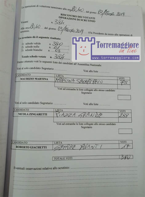 Anche a Torremaggiore si sono svolte le elezioni primarie per la scelta del nuovo segretario dem con un flusso ed un esito in linea con l’affluenza territoriale e nazionale. Hanno votato nello specifico 384 persone , di cui in sede di spoglio sono state accertate 380 schede valide.