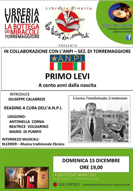 Primo Levi a cento anni dalla nascita: evento a Torremaggiore il 15 dicembre 2019 alla Bottega dei Miracoli