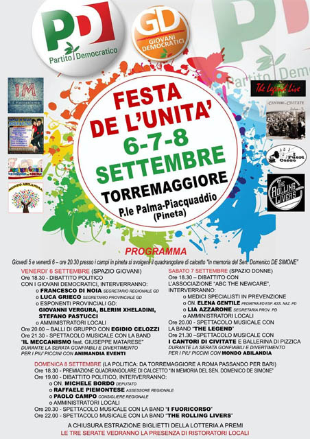 Programma della festa de L’Unità dal 6 all’8 settembre 2019 a Torremaggiore