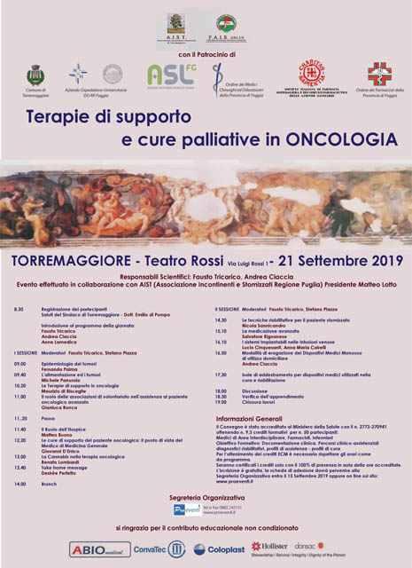 Terapie di supporto e cure palliative in oncologia: se ne parla a Torremaggiore il 21 settembre 2019 al Teatro Luigi Rossi