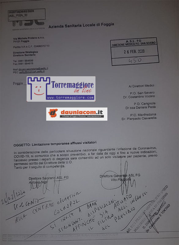 La Direzione Generale dell’ASL FG ha diramato un ordine di servizio il 26/02/2020 attuando una limitazione temporanea dell’afflusso dei visitatori negli Ospedali dell’ASL Fg ovvero San Severo, Cerignola e Manfredonia: è ammesso un solo visitatore per paziente dal 26 febbraio 2020 fino a nuove indicazioni, di seguito il documento ufficiale.