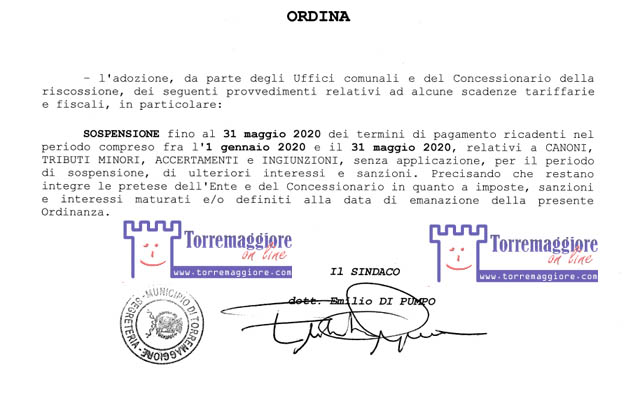 Il Sindaco di Torremaggiore Emilio DI Pumpo comunica alla Cittadinanza che, a seguito dell’emergenza epidemiologica da COVID-19, sono sospesi i termini dei pagamenti relativi a canoni, tributi minori, accertamenti ed inguinzioni fino al 31 maggio 2020, come da ordinanza allegata.