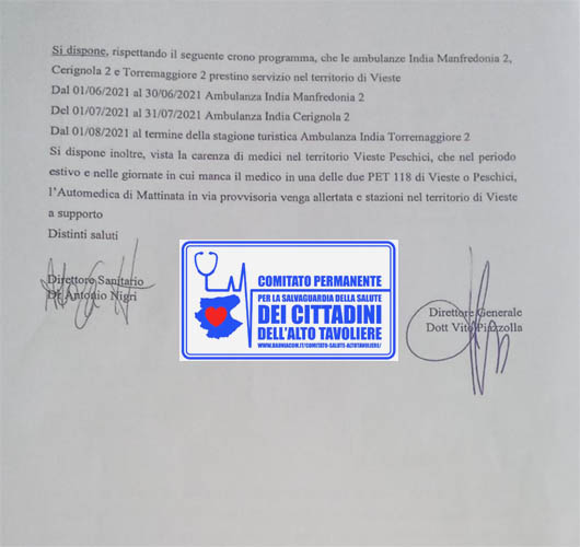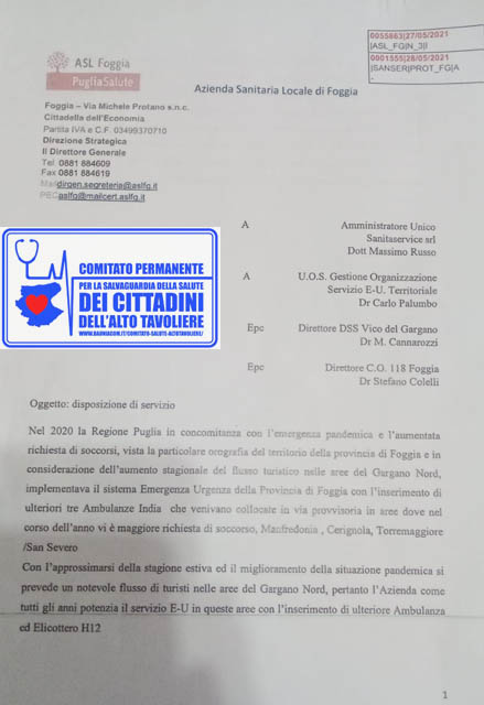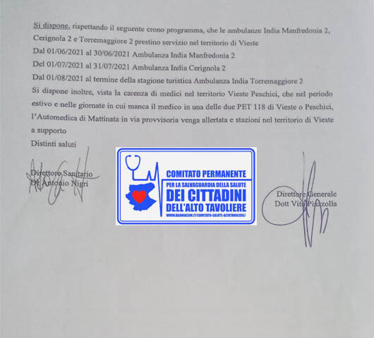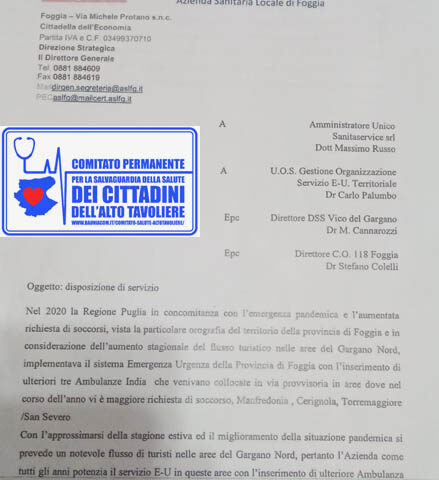 Il Comitato Salute Alto Tavoliere della Puglia aveva inviato nei giorni scorsi una PEC alla Direzione Generale dell’ASL FG, alla Regione Puglia, all’Assessorato Regionale alla Salute e al Dipartimento Salute della Regione Puglia per esprimere preoccupazione per la disposizione di servizio della Direzione Generale dell’ASL Fg del 27/05/2021 che elimina la seconda ambulanza del 118 a Torremaggiore per le esigenze turistiche della città di Vieste ad agosto e a settembre 2021. Di seguito ecco l’ordine di servizio. ( leggi la nota completa del 30 maggio 2021)