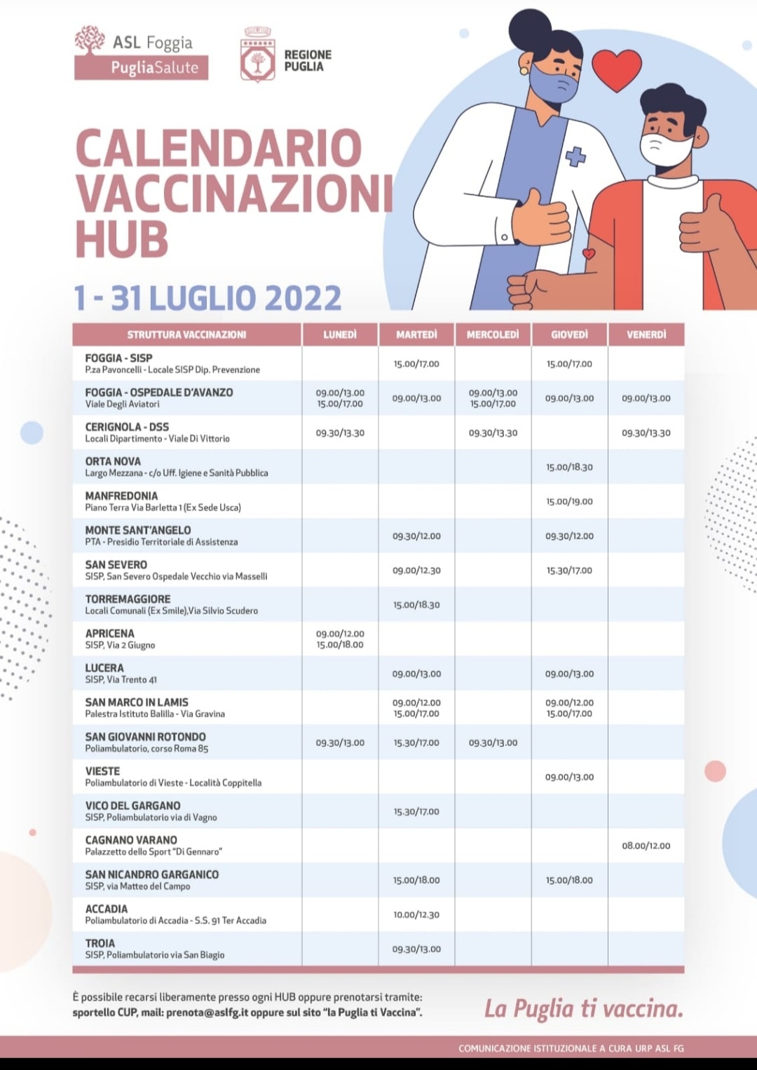 Calendario provinciale vaccinazioni anti Covid a luglio 2022: l’ASL FG ha disposto che a Torremaggiore l’Hub in Via Silvio Scudero alla Zona Pip sarà aperto il martedì dalle 15.00 alle 18.30