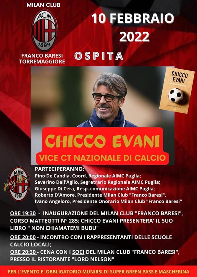 Sono nato nel 1979 , cresciuto con il mito del Milan di Sacchi in cui Chicco Evani è stato un assoluto protagonista. Chicco non è stato solo un calciatore vincente ma soprattutto è stato ed è un uomo stimato da tutti perchè ha sempre trasmesso dentro e fuori dal campo quei valori che ogni uomo di sport deve avere : sacrificio, lealtà e spirito di squadra. In quel Milan tanti erano campioni dentro ma soprattutto fuori dal campo ed è per questo che quella squadra , ammirata da tutti, ha raggiunto traguardi prestigiosi in Italia, in Europa e nel Mondo.Per i tifosi rossoneri un po’ grandicelli come me, indelebile è il ricordo della finale di coppa intercontinentale nel lontano 17 dicembre 1989 : Chicco ci regalò la coppa ed il titolo di Campioni del Mondo siglando la rete decisiva all’ultimo minuto dei supplementari.Oggi ancor più di ieri è un onore per me e per tutti noi ospitarlo in quanto Chicco Evani è attualmente il Vice CT della Nazionale di calcio .Chicco , dunque, non rappresenta solo i tifosi rossoneri ma un’intera Nazione: in un momento devastante dovuto alla Pandemia ci ha regalato una gioia immensa portando, insieme a tutto il team azzurro, la nazionale italiana sul tetto d’Europa.Spero che l’evento possa essere portato a termine perché questo è un periodo difficile e dietro l’angolo c’è sempre il rischio di un rinvio . Noi faremo tutto ciò che è nelle nostre possibilità per organizzare l’inaugurazione del Club in sicurezza sia in sede per la presentazione del libro di Evani che nel locale scelto per la cena con posti limitati ai soci.In qualità di Presidente del Milan club “Franco Baresi ” Torremaggiore voglio fare un ringraziamento particolare fin d’ora, al coordinatore Regionale AIMC Puglia Pino de Candia , al segretario Regionale AIMC Puglia Severino Dell’Aglio , Resp. Comunicazione Regionale AIMC Puglia Giuseppe di Cera , all’instancabile segretario Milan Club Torremaggiore Matteo Russo, a tutto il direttivo , i soci del Milan Club Torremaggiore, e dulcis in fundo alla persona che più di tutti ci sta sostenendo nell’organizzazione dell’evento ovvero il Dott. Ivano Angeloro, Presidente Onorario del nostro Milan Club . Vi aspettiamo giovedi 10 Febbraio 2022.