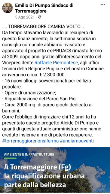 Nella seconda interrogazione si è chiesto di conoscere lo stato di fatto del finanziamento regionale relativo al cosiddetto Parco San Pio ex PRUACS del Comune di Torremaggiore. Altresì è stato chiesto all’amministrazione quali provvedimenti siano stati assunti nei termini prescritti a pena di revoca della misura concessa o se siano intervenuti provvedimenti in tal senso.