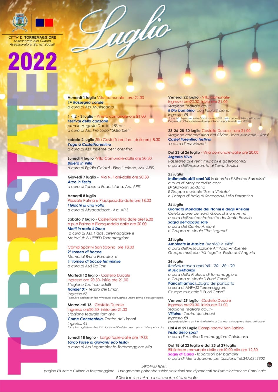 L’amministrazione comunale dà il via alle attività estive previste per il mese di Luglio in quella che è chiamata : TORRESTATE 2022. Insieme alle associazioni e agli artisti del Territorio sono previste attività di vario genere : dalla Musica alla Cultura, dallo Sport alla Gastronomia. L’amministrazione Augurando a tutti una buona estate invita tutti i cittadini alla partecipazione alle varie manifestazioni . Il sindaco Emilio Di Pumpo Sindaco di Torremaggiore e l’intera amministrazione. Programma curato dell’Assessorato alla Cultura e dall’assessorato al Welfare.