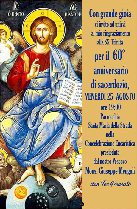 (TMOL) Il 25 agosto 2023 ricorre il 60° anniversario di sacerdozio di Don Teo Pensato. Si terrà una Santa Messa di ringraziamento alle 19 a Torremaggiore presso la Parrocchia Santa Maria della Strada presieduta dal nostro Vescovo Mons Giuseppe Mengoli. Tutta la cittadinanza è invitata vivamente a partecipare!
