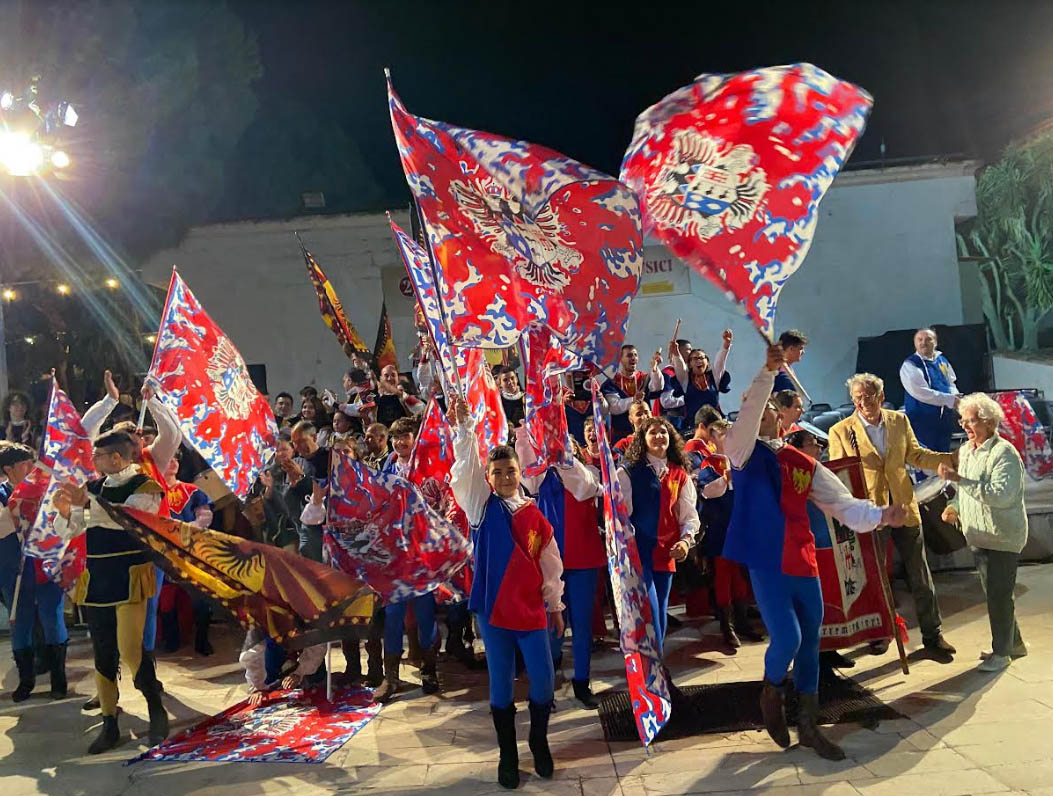 (TMOL) In data 2 Settembre 2023 si è svolto a Castellaneta in provincia di Taranto la seconda edizione del Festival degli Sbandieratori “trofeo Fidelissima Civitas ” classificandosi al primo posto il gruppo sbandieratori e musici di Torremaggiore. “Grande gioia per i ragazzi che hanno meritato dopo tanto impegno la vittoria di questo trofeo mettendosi in gioco con altri gruppi, siamo stati grandi tutti sia musici che sbandieratori” è quanto riferisce il Vicepresidente del gruppo Emiliano Leone , anche lo stesso Antonio Di Cesare , presidente dell’Associazione Sbandieratori e Musici Florentinum di Torremaggiore “contento per questo risultato raggiunto da tutti e sempre pronto a portare in alto il nome del nostro comune nella varie Piazze di tutta itali”. Infine aggiunge Augusto Capillo , capo degli sbandieratori ” notevole successo di consensi da parte del pubblico e giuria, ora pronti alcuni di noi sbandieratori a partecipare questo fine settimana alle gare nazionali sbandieratori della LIS ( Lega italiana sbandieratori) a Cavriago, Reggio Emilia”.