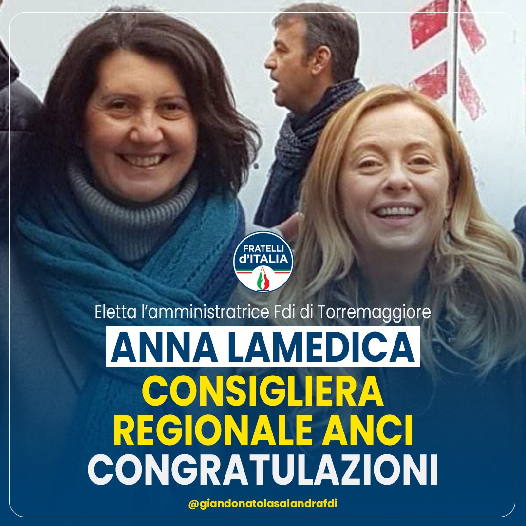 “La elezione di Anna Lamedica nel Consiglio regionale di Anci Puglia è motivo di orgoglio e premia un percorso politico personale fatto di competenza e passione nonché la città di Torremaggiore, finalmente rappresentata all’interno dell’Associazione Nazionale Comuni Italiani della nostra regione”. Lo afferma il coordinatore cittadino di Fratelli d’Italia Torremaggiore, Michele Di Virgilio, che prosegue: “Spiace tuttavia rilevare come, ancora una volta, i massimi rappresentati dell’Amministrazione comunale torremaggiorese di centrosinistra siano stati assenti in occasione di un importante evento come quello dell’assemblea congressuale di Anci Puglia svoltasi ieri a Taranto. Segno tangibile dello scarso interesse da parte del sindaco Di Pumpo nei confronti di qualsiasi ambito che abbia a che fare tanto con gli impegni istituzionali, quanto con il governare la città. Al netto di ciò, desidero augurare buon lavoro ad Anna Lamedica, consigliere comunale di Fratelli d’Italia, che saprà svolgere al meglio il suo ruolo all’interno di un consesso strategico come quello di Anci Puglia”.