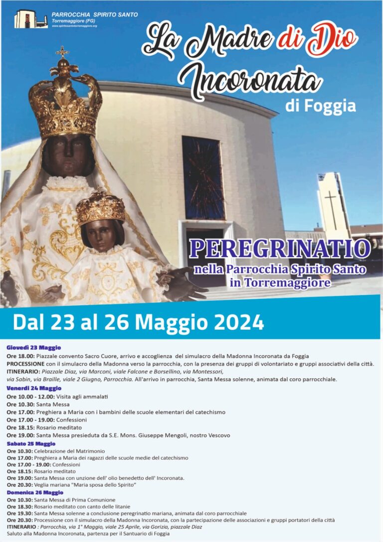 (TMOL) La comunità parrocchiale dello Spirito Santo di Torremaggiore è lieta di comunicare che dal 23 al 26 maggio si svolgerà la peregrinatio della Madonna Incoronata di Foggia a Torremaggiore nella Parrocchia dello Spirito Santo. L’accoglienza del simulacro della Madonna è previsto il 23 maggio alle ore 18.00 presso la Chiesa del Sacro Cuore nel quartiere San Matteo. Seguirà processione verso la Parrocchia dello Spirito Santo dove il simulacro resterà fino a domenica 26 maggio. Ci saranno messe e catechesi effettuate dai padri orionini di Foggia. Tutta la comunità cittadina è invitata a partecipare.