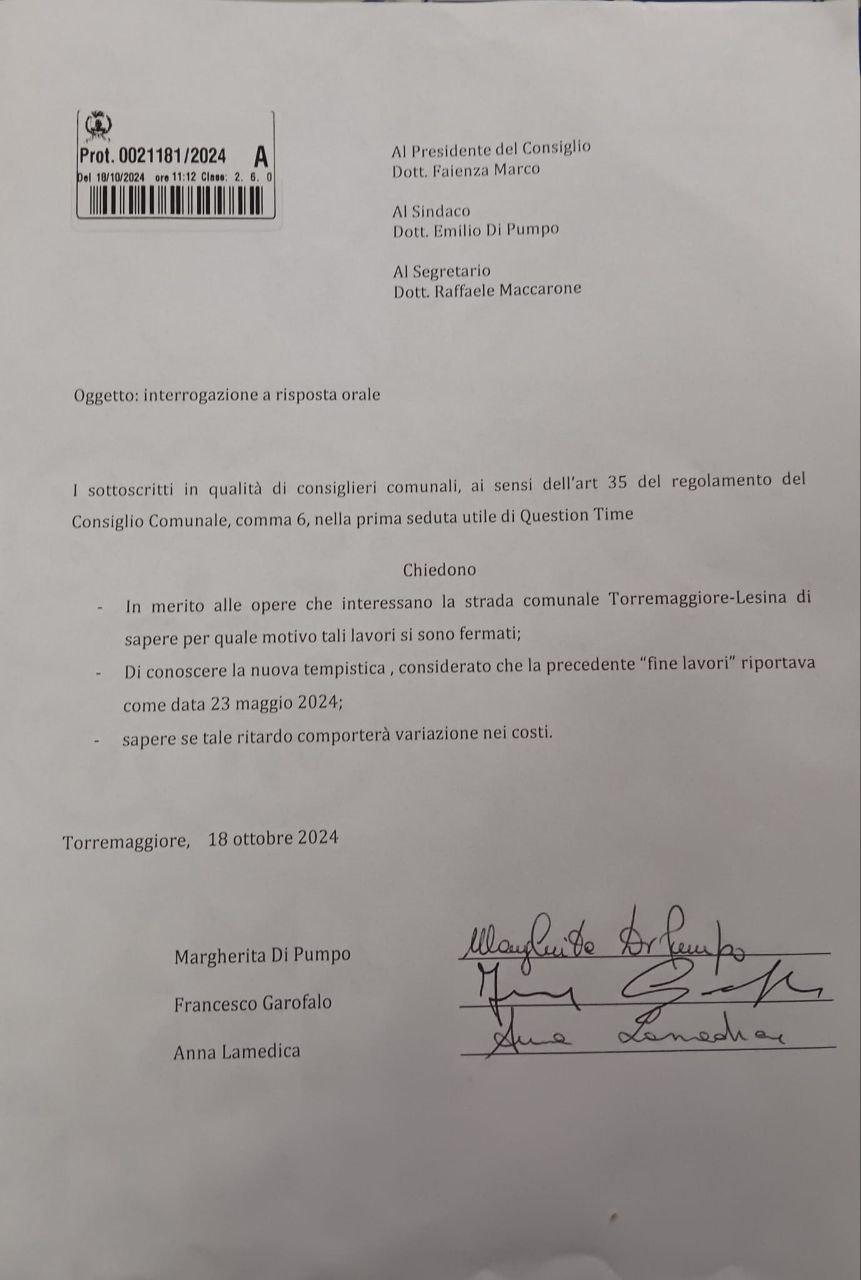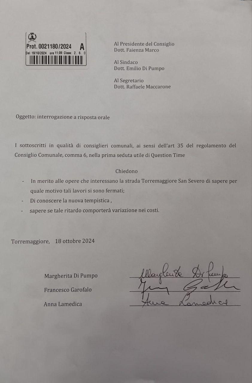 E che si fa sul serio lo dimostrano le carte e non le chiacchiere. Come Consiglieri di Minoranza abbiamo presentato ben due richieste di chiarimenti relative ai lavori sulla Torremaggiore – Lesina e Torremaggiore – San Severo. Riteniamo, infatti, che il silenzio degli “addetti ai lavori” sui vari cantieri aperti ormai da tempi memorabili sia ingiustificabile e non più accettabile. È diritto dei cittadini conoscere i tempi, il motivo degli stalli, nonché eventuali variazioni dei finanziamenti. La modalità scelta è quella del question time*, ovvero a domanda/risposta da parte dei principali attori coinvolti nelle questioni.