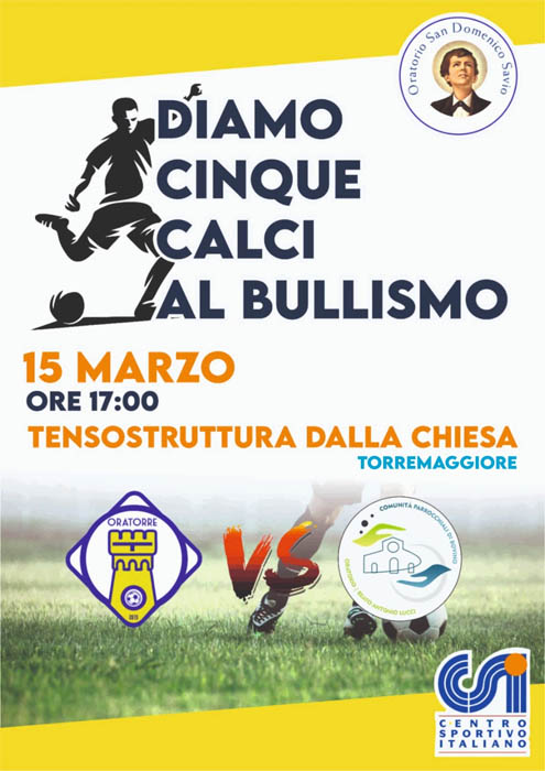 ” Da mesi lavoriamo, come CSI Torremaggiore ad un progetto di collaborazione con le realtà locali e provinciali, con l’ obbiettivo di sensibilizzare i ragazzi attraverso lo sport su specifiche tematiche. Nel pomeriggio del 15 marzo 2024 i nostri ragazzi under 16 hanno giocato una partita per dire no al bullismo attraverso lo sport.Perché siamo convinti che se ribaltiamo i paradigmi, allarghiamo le visioni e facciamo squadra con tutte le agenzie educative del territorio, anche una associazione sportiva può diventare un luogo di arrivo, di passaggio, di scambi culturali e sportivi , insieme alla scuola e alle istituzioni. Facendo squadra. C’è tanto lavoro dietro… perciò oggi la soddisfazione è doppia per aver realizzato questa manifestazione sportiva, che ha visto la partecipazione del nostro Parroco e nostro primo tifoso Don Leonardo Di Mauro, del comandante della stazione carabinieri città di Torremaggiore Giuseppe Gentile e il vice comandante Antonio Pistillo. Con la stazione dei carabinieri di Torremaggiore abbiamo in cantiere altri progetti che ci vedranno coinvolti nei prossimi mesi. A tal proposito è doveroso ringraziare il vice comandante Antonio Pistillo per la grande disponibilità e sensibilità che ha dimostrato verso il territorio. Tanto calcio a 5 giocato, bene da entrambi i gruppi sportivi. La partita di calcio a 5 è stata giocata da i ragazzi under 16 del csi Torremaggiore verso gli amici di Bovino, il quale va un grazie speciale al mister Michele Marseglia per la grande disponibilità. Ma questa manifestazione è solo il punto di partenza per nuovi obiettivi da raggiungere. ” – E’ quanto ha dichiarato con una nota ufficiale il CSI Torremaggiore.