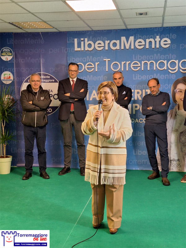 (TMOL) “Onestà, competenza e trasparenza al servizio dei torremaggioresi sono i tre pilastri su cui si fonda il mio impegno di candidata Sindaco di Torremaggiore”. Così Margherita Di Pumpo, candidata primo cittadino del centrodestra, nella serata del 27 marzo 2024 , in occasione dell’inaugurazione del comitato elettorale su Corso Giacomo Matteotti 187. All’evento hanno preso parte l’On. Giandonato La Salandra di Fratelli d’Italia, i consiglieri regionali Giannicola De Leonardis, coordinatore provinciale FdI e Vice Presidente del Consiglio della Regione Puglia insieme a Paolo Dell’Erba, coordinatore provinciale di Forza Italia; Lino Monteleone, dirigente provinciale di Forza Italia; Alessandro Acquafresca, vice coordinatore cittadino della Civica Per Torremaggiore; Luigi Ciavarella, vice presidente cittadino del circolo di Fratelli d’Italia.