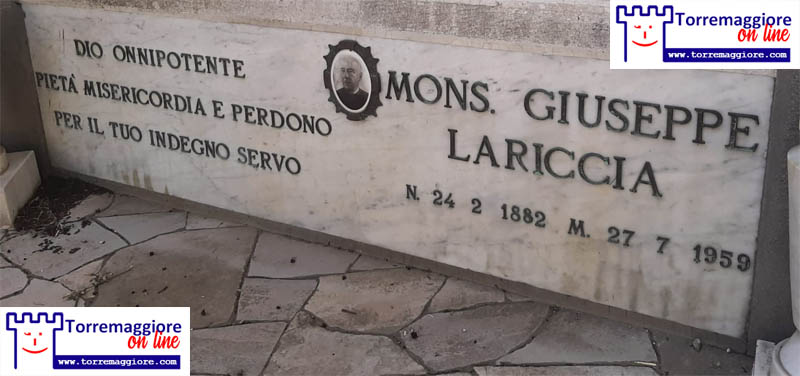 Mons. Giuseppe Lariccia (24/02/1882 – 27/07/1959) Arciprete, maestro di scuola e di musica, fu co-fondatore nel 1929 della Scuola Musicale “Luigi Rossi” di Torremaggiore. Fu sua l’idea della creazione della Casa per l’Infanzia Abbandonata che avviò negli anni cinquanta e dopo della sua dipartita fu terminata da Padre Arturo D’Onofrio da Visciano. Nel 1912 si recò a Bergamo dove si abilitò alla docenza nella scuola elementare e perfezionò la lingua francese. Sulle orme di Don Bosco si dedicò completamente all’infanzia ed alla gioventù bisognosa. Ha creato dagli anni Trenta molti pezzi musicali che vengono tutt’ora eseguiti durante la Processione dei Misteri il Venerdì Santo. Realizzatore di molti spettacoli teatrali (tra cui il memorabile “Cappuccetto Rosso” del 1932), fu anche direttore dell’orchestrina e del coro della Parrocchia di Santa Maria della Strada. Coordinatore, progettista e patrocinatore dell’umanitaria Casa per l’infanzia abbandonata. Autore dello scritto pregiato “Dieci Comandamenti”. Mons. Laricca è ricordato per il suo rigore morale e per la sua scrupolosa metodologia scolastica. Torremaggiore gli ha intitolato una strada nei pressi del Castello Ducale al posto del vecchio toponimo Via Maiella. Fu Cappellano assistente della confraternita del Santissimo Rosario, assistente ecclesiastico delle donne e della gioventù femminile di Azione Cattolica, ed organizzò corsi di taglio e cucito. Fu nominato cappellano maggiore della confraternita del Santissimo Crocifisso nella Chiesa di Santa Maria degli Angeli e, qui, dal 16 marzo 1936, fu direttore spirituale del Terz’ Ordine Francescano femminile cittadino. E’ deceduto il 27 luglio 1959. E’ sepolto nella tomba di famiglia all’interno del cimitero monumentale di Torremaggiore.