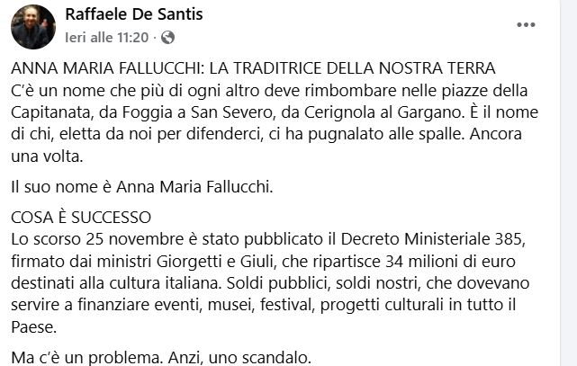C’è un nome che più di ogni altro deve rimbombare nelle piazze della Capitanata, da Foggia a San Severo, da Cerignola al Gargano. È il nome di chi, eletta da noi per difenderci, ci ha pugnalato alle spalle. Ancora una volta. Il suo nome è Anna Maria Fallucchi. COSA È SUCCESSO Lo scorso 25 novembre è stato pubblicato il Decreto Ministeriale 385, firmato dai ministri Giorgetti e Giuli, che ripartisce 34 milioni di euro destinati alla cultura italiana. Soldi pubblici, soldi nostri, che dovevano servire a finanziare eventi, musei, festival, progetti culturali in tutto il Paese. Ma c’è un problema. Anzi, uno scandalo. Esiste una legge dello Stato, la cosiddetta “Clausola del 40%”, che obbliga le amministrazioni centrali a destinare almeno il 40% delle risorse ordinarie al Mezzogiorno. È una legge fatta proprio per evitare che il Sud venga sempre dimenticato, sempre escluso, sempre derubato. Sapete quanto è andato al Sud di quei 34 milioni? ZERO. Nemmeno un centesimo. Dei 34 milioni: