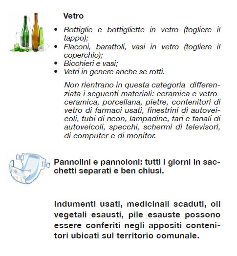 appositi contenitori ubicati sul territorio comunale. Pannolini e pannoloni: tutti i giorni in sacchetti separati e ben chiusi. Non saranno ritirati i rifiuti se conferiti in date diverse da quelle indicate nel presente calendario o comunque se difformi dalle indicazioni. In tal caso tale comportamento sarà segnalato agli organi preposti.