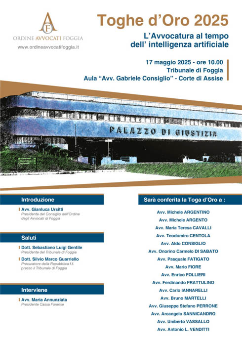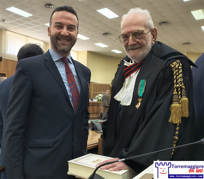 (TMOL) Si è svolta nella mattinata del 17 maggio 2025 presso l’Aula “Gabriele Consiglio” – Corte di Assisse del Tribunale di Foggia la cerimonia solenne per la consegna della Toga d’Oro per sedici Avvocati della Capitanata. Per Torremaggiore era presente l’Avvocato Mario Fiore ( classe 1937) iscritto all’Ordine degli Avvocati di Foggia dal 5/05/1973 ed esercita tutt’ora la professione forense. Alla premiazione sono intervenuti l’Avv Gianluca Ursitti (Presidente del Consiglio dell’Ordine degli Avvocati di Foggia), il Dott. Sebastiano Luigi Gentile ( Presidente del Tribunale di Foggia) e il Dott. Silvio Marco Guarriello ( Procuratore della Repubblica f.f. presso il Tribunale di Foggia). E’intervenuta anche la Presidente della Cassa Forense nella persona dell’Avv. Maria Annunziata.